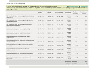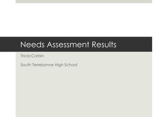The needs assessment survey of teachers at South Terrebonne High School found that: 1) 32 out of 41 teachers responded, with some skipping questions, 2) Teachers were most interested in training on interactive whiteboards and student response systems, though few have access to these, and 3) Most teachers were not satisfied with technology availability and would prefer professional development on staff development days, but none were scheduled for the rest of the year.