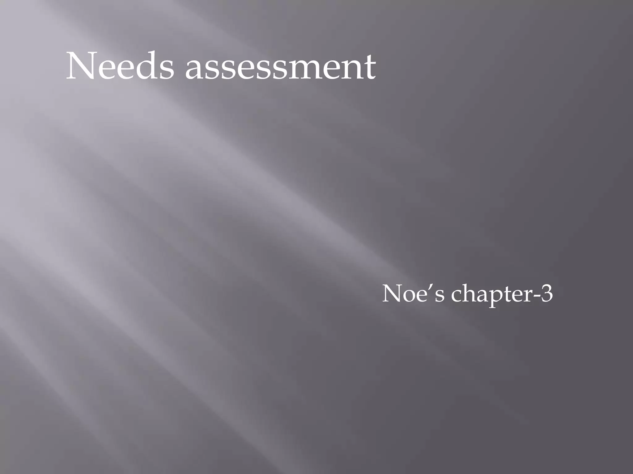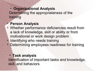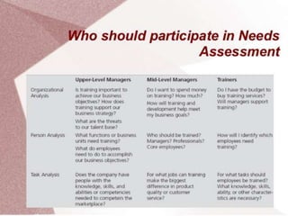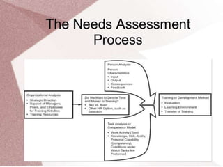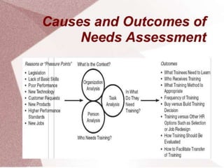 A needs assessment is the process of identifying performance requirements and the gap between required and current performance. Needs assessments are necessary to ensure training programs have the correct content, objectives, and methods, and that trainees have the required skills. Needs assessments involve collecting data from subject matter experts, management at multiple levels, and job incumbents to determine training needs and how training can fulfill business needs.