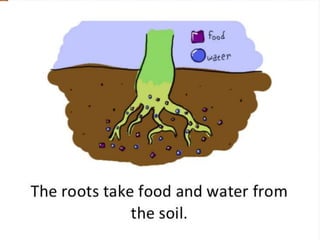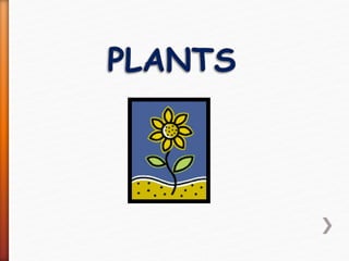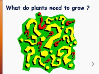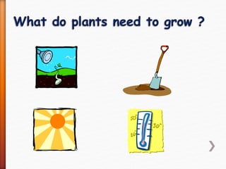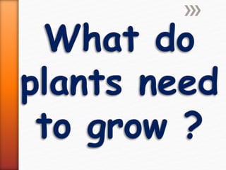 Plants require several key factors for proper growth including water for germination and growth, sunlight for photosynthesis to produce food, minerals from soil for healthy growth, and suitable temperatures within an optimal range to avoid affecting the plant's growth. The document discusses the necessary conditions plants need, specifically water, sunlight, minerals from soil, and appropriate temperatures.