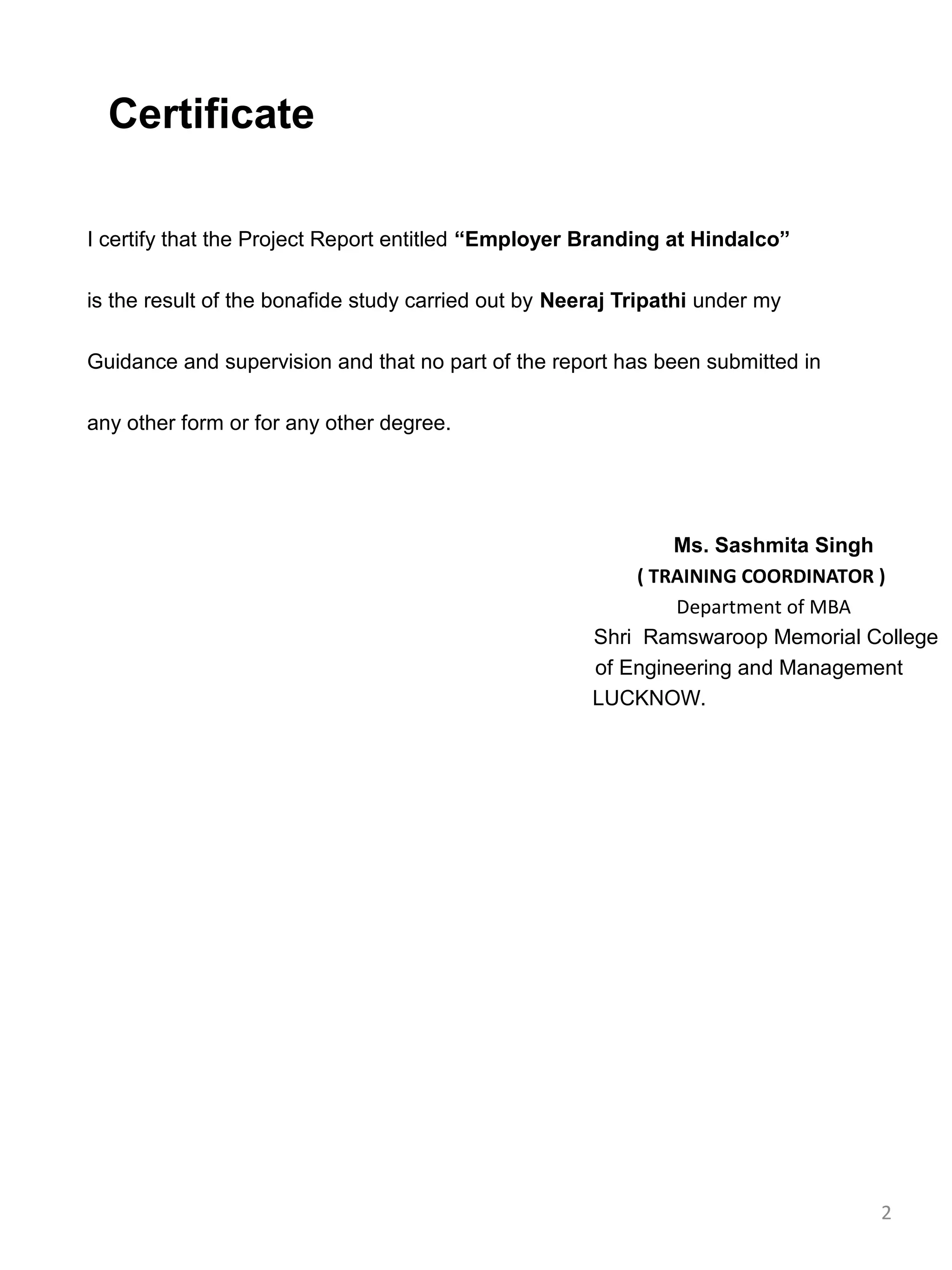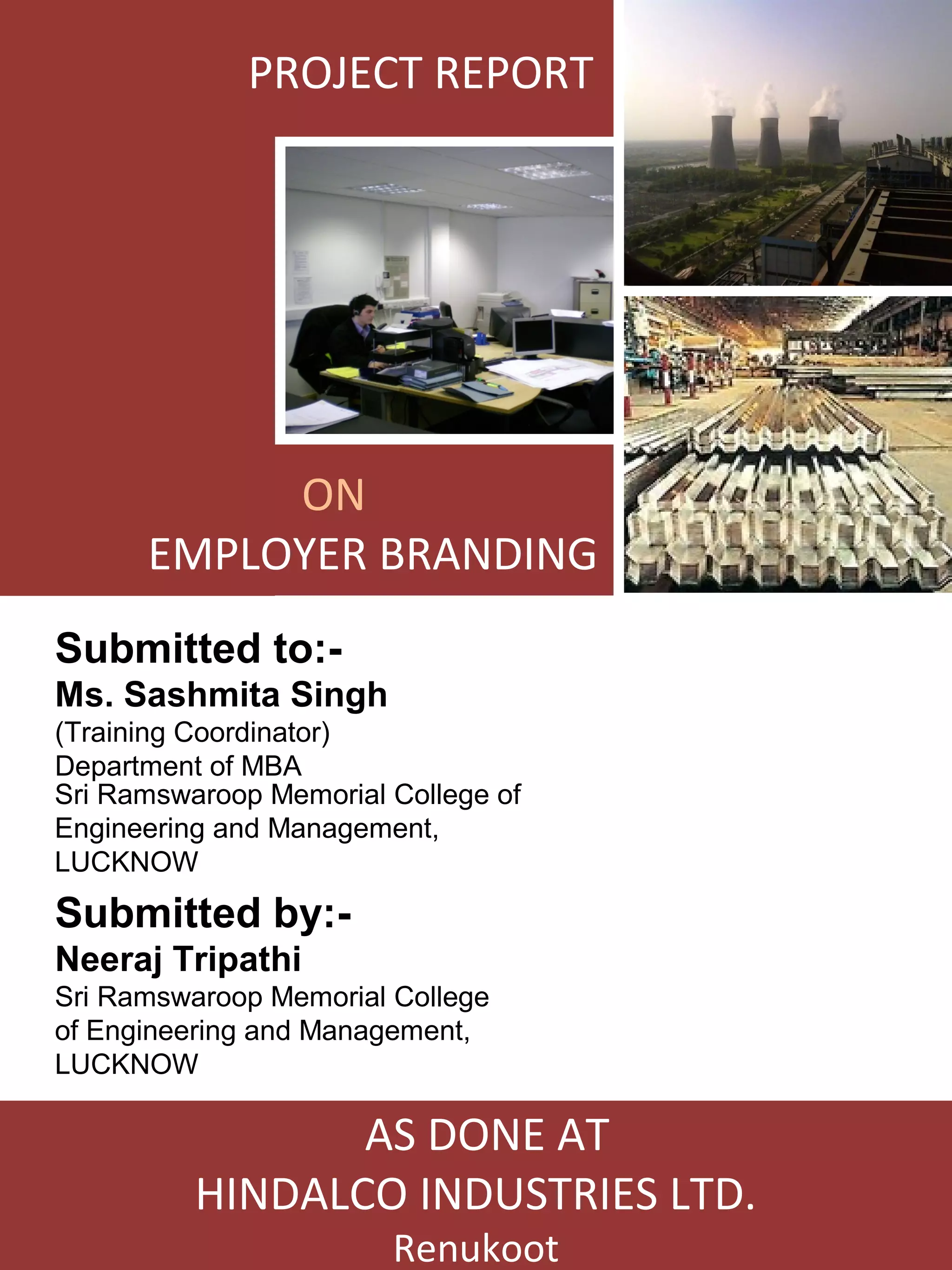 The document provides information about a project report submitted by Neeraj Tripathi on employer branding at Hindalco Industries Limited in Renukoot, India. It includes a certificate signed by the training coordinator, a declaration by Neeraj Tripathi, a table of contents, diagrams, graphs and statistical contents related to the project. The project report covers Hindalco's history, landmarks, businesses, environmental initiatives and employer branding analysis through employee questionnaires.
