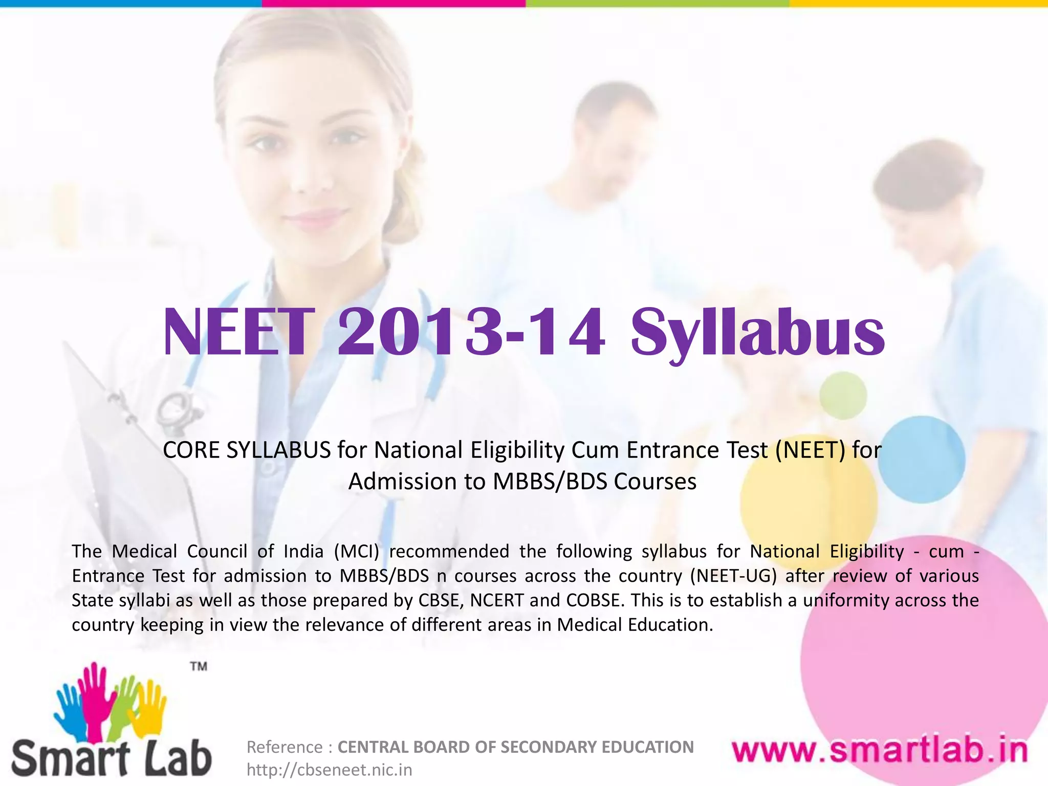 The NEET 2013-14 syllabus outlines the core subjects and topics for the National Eligibility cum Entrance Test for MBBS/BDS admissions. It includes comprehensive details for Class 11 and Class 12 Physics and Chemistry, specifying units such as laws of motion, thermodynamics, electrostatics, and chemical bonding, among others. This structure aims to standardize the curriculum across India, ensuring a uniform foundation for medical studies.