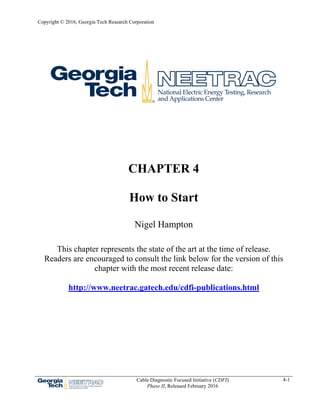 This document provides guidance on selecting the most appropriate cable diagnostic program for a medium voltage cable system. It discusses the evolution of cable diagnostics from 2006 to 2014 based on surveys of over 100 utilities. The use of some techniques, such as very low frequency withstand tests, has increased in that time period due to improvements in equipment and knowledge. The document provides a five-step process called SAGE for selecting diagnostic techniques in a transparent manner and offers information and considerations to help users choose techniques that best suit their needs and risk tolerance.