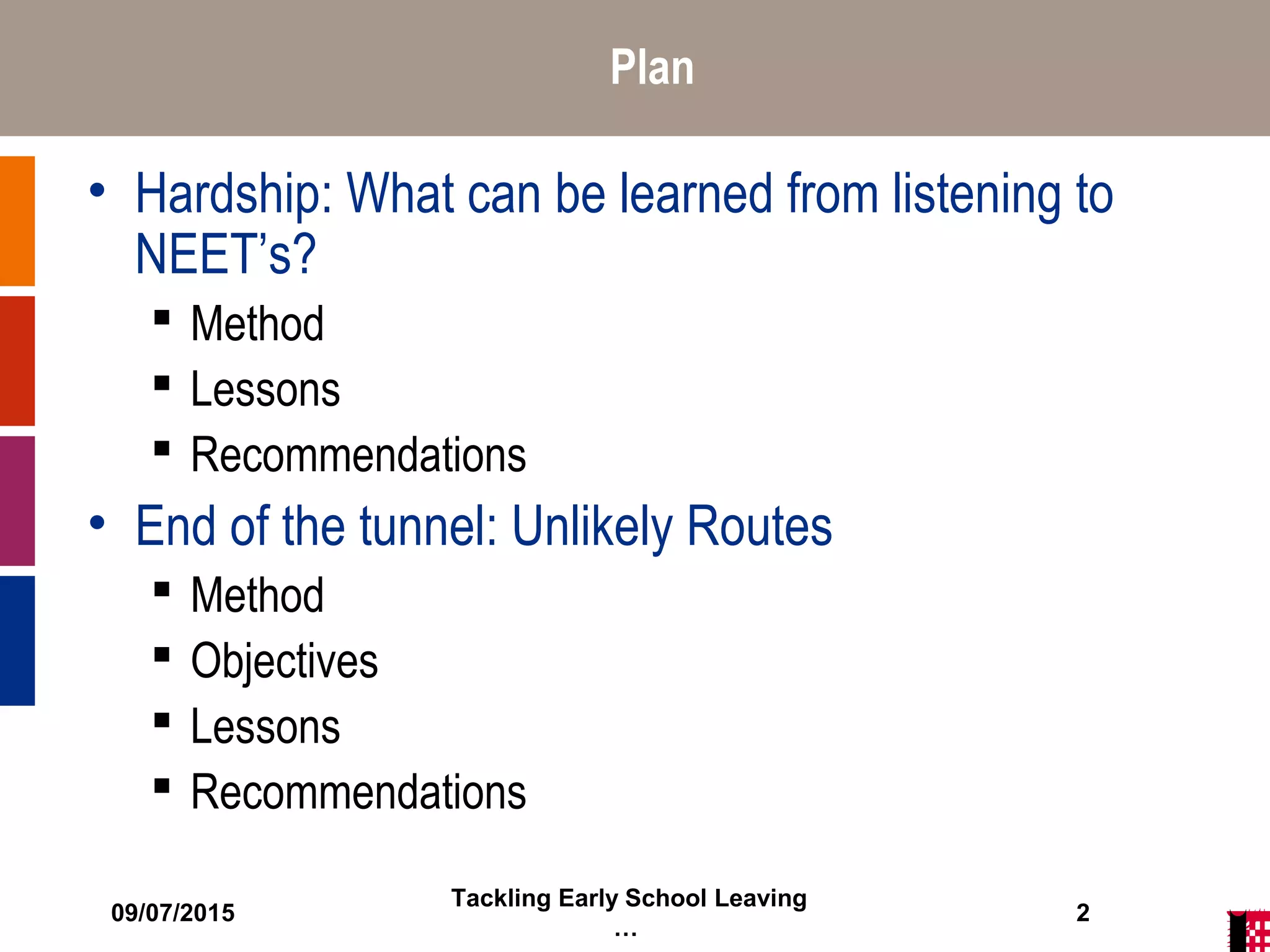 The document discusses two presentations on tackling early school leaving given in Luxembourg in 2015. The first presentation examines what can be learned from listening to young people who are neither in employment, education, or training (NEETs). It describes qualitative interviews with 31 NEETs to understand their experiences and identify factors influencing vulnerability. The second presentation looks at "unlikely routes" taken by 30 youth who were supported by various social programs. It aims to identify success factors for overcoming difficult trajectories and supporting future youth. Key levers for change included triggering events, chance encounters, influential social workers, and support from peers.