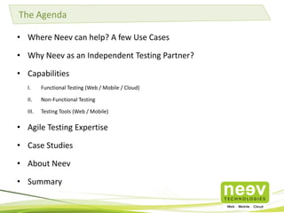 Neev Independent Testing Services offers comprehensive independent testing solutions, specializing in functional and non-functional testing across various platforms like web, mobile, and cloud. They have a strong expertise in agile processes, robust testing tools, and successful case studies demonstrating their capabilities in improving software quality and efficiency. Their services cater to diverse industries and project needs, ensuring a fast go-to-market strategy and scalable testing solutions.
