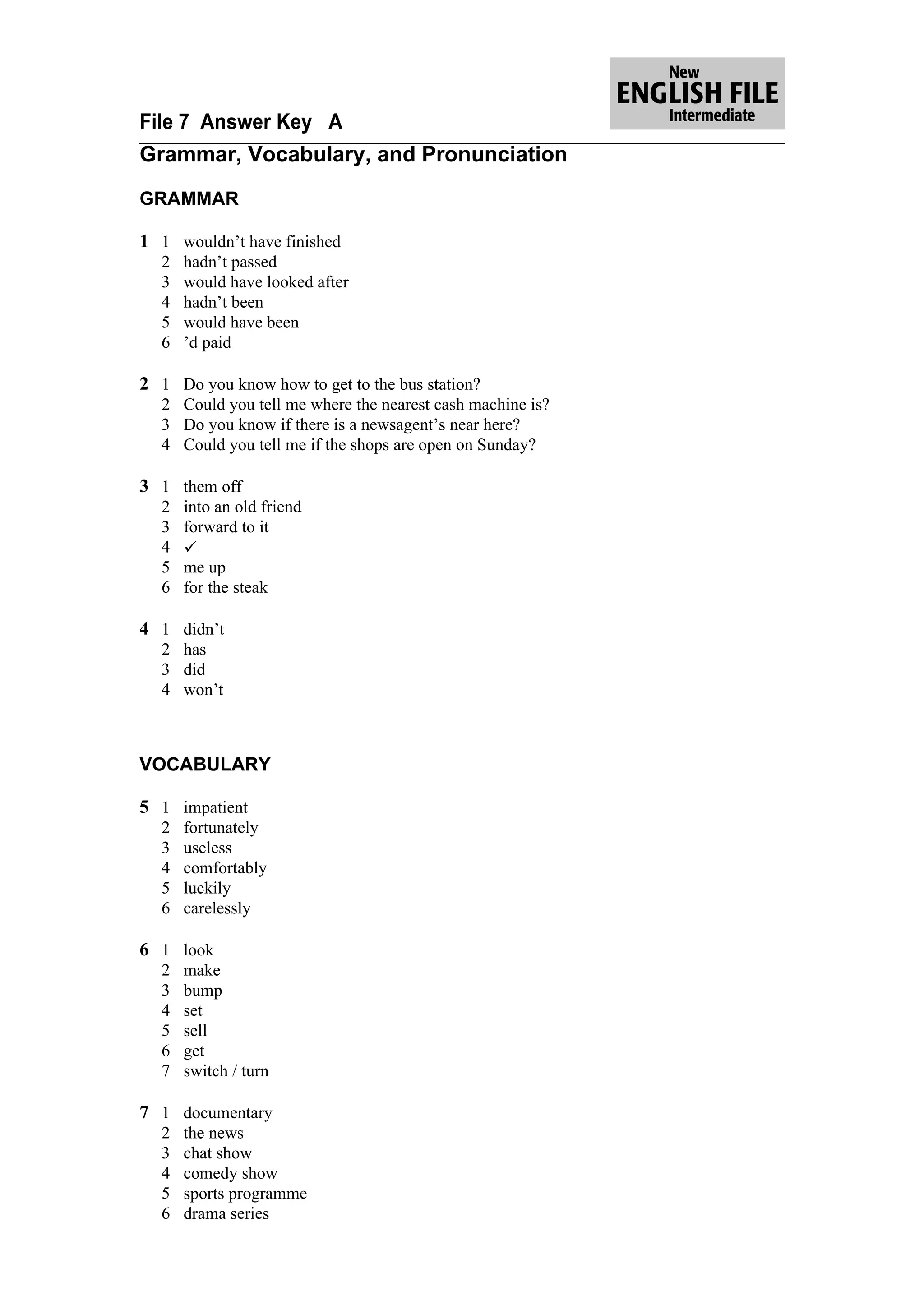 This document contains an answer key for a grammar, vocabulary, and pronunciation exam. It provides the correct answers to multiple choice and fill-in-the-blank grammar questions, vocabulary questions testing word meaning and usage, and pronunciation questions testing pronunciation of words. It also includes sample answers and grading criteria for reading comprehension, writing, listening, and speaking sections.