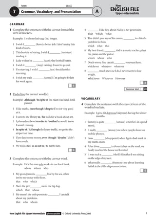 The document provides grammar, vocabulary, and pronunciation exercises for an English language lesson. It includes fill-in-the-blank sentences testing verb forms, underlining correct word choices, completing sentences with the right word, adding prefixes to words, matching words with similar sounds, and identifying stressed syllables in words. The exercises cover a range of grammatical structures and vocabulary topics to practice English skills.