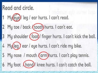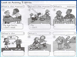 The document describes various ailments and the inability to perform certain actions as a result. It lists having a toothache which prevents eating, an earache which prevents listening well, and a cold which prevents sleeping. Blank lines are included for the reader to fill in other ailments they've experienced and what ability was impacted. The structure and repetitive pattern suggests this is meant to help children learn about how illnesses can affect functioning.
