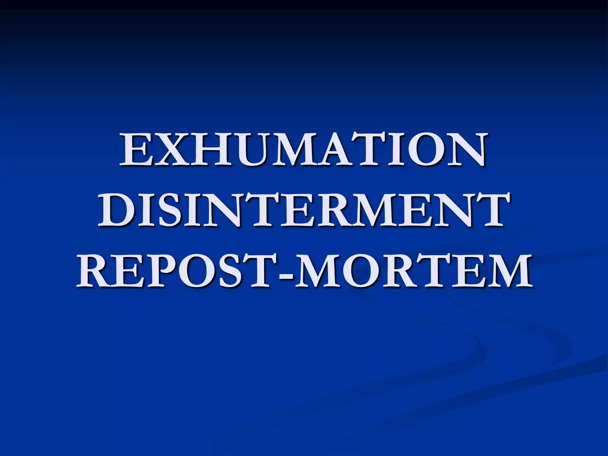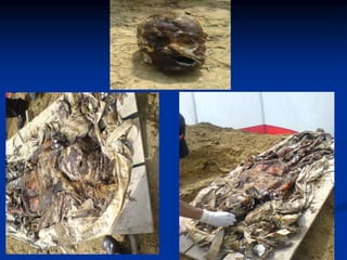 Exhumation involves the lawful removal of a buried corpse from the grave for autopsy examination or to determine the cause of death. It requires proper authorization and is performed under legal requirements with a team including a duty magistrate, police, and medical officer. Samples including earth, hair, nails, teeth, bones, and viscera are collected. Autopsies on exhumed bodies can provide identification or clarify ambiguous initial autopsy findings when foul play is suspected. Artifacts introduced between death and autopsy or during the autopsy itself can potentially mislead interpretations if not properly identified and accounted for. A negative or obscure autopsy may result from inadequate history, examination, samples, training, or other factors.