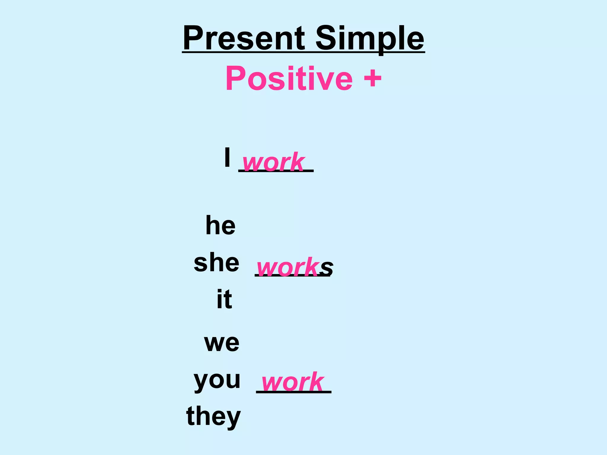 This document provides examples of using the present simple tense in English to describe regular or habitual actions. It shows the positive, interrogative, and negative forms of the present simple tense using the verbs "work", "write", "come", and "go" with the pronouns "I", "he", "she", "it", "we", "you", and "they". Examples are given to demonstrate asking and answering yes/no questions as well as making negative statements in the present simple tense.