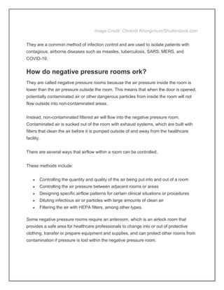 Negative pressure rooms, also called isolation rooms, are used in hospitals to isolate patients with infectious diseases from others. They work by maintaining a lower air pressure inside the room so that contaminated air does not flow out when the door is opened. Several methods are used to control airflow and filter exhaust air before it leaves the room. There are four main types of isolation rooms - Class S rooms with neutral pressure, Class P positive pressure rooms, Class N negative pressure rooms that protect those outside, and high-security Class Q rooms with additional safeguards like anterooms. Room pressure can be tested simply with smoke or tissue, but electronic monitors offer continuous monitoring at a higher cost.