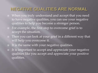 The document discusses the importance of accepting both negative and positive qualities as essential for personal growth and self-esteem. It emphasizes that viewing negative experiences as opportunities for learning and improvement can lead to becoming a stronger person. Ultimately, self-esteem is built through the daily act of striving to improve oneself.