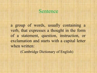 The document discusses different types of sentences in English grammar: assertive sentences, interrogative sentences, imperative sentences, and exclamatory sentences. It also discusses negative sentences, which contain words expressing negation like "no", "not", "none", "nothing", and "never". Negative sentences can be formed by using "not" after auxiliary or modal verbs, or with contractions like "isn't" or "didn't" along with verbs like "do", "does", and "did". Examples of different sentence types are provided.