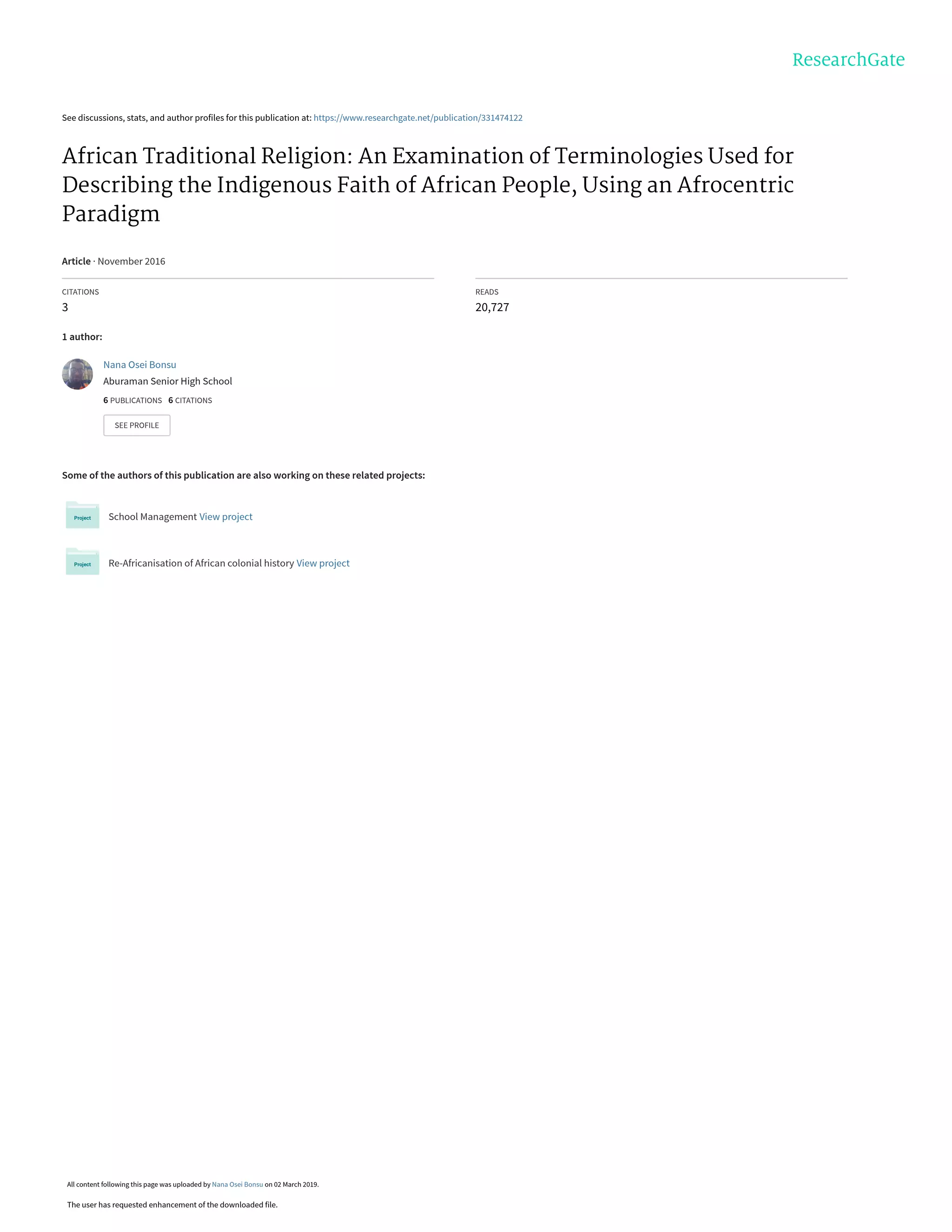 The document examines the terminologies used to describe African traditional religion (ATR), arguing that many are racially motivated and inappropriate. It advocates for an afrocentric approach to studying ATR, suggesting that African people should define their spirituality using culturally relevant terms. The author highlights the need for decolonization of African religious studies from Eurocentric perspectives to accurately reflect the beliefs and practices of African peoples.