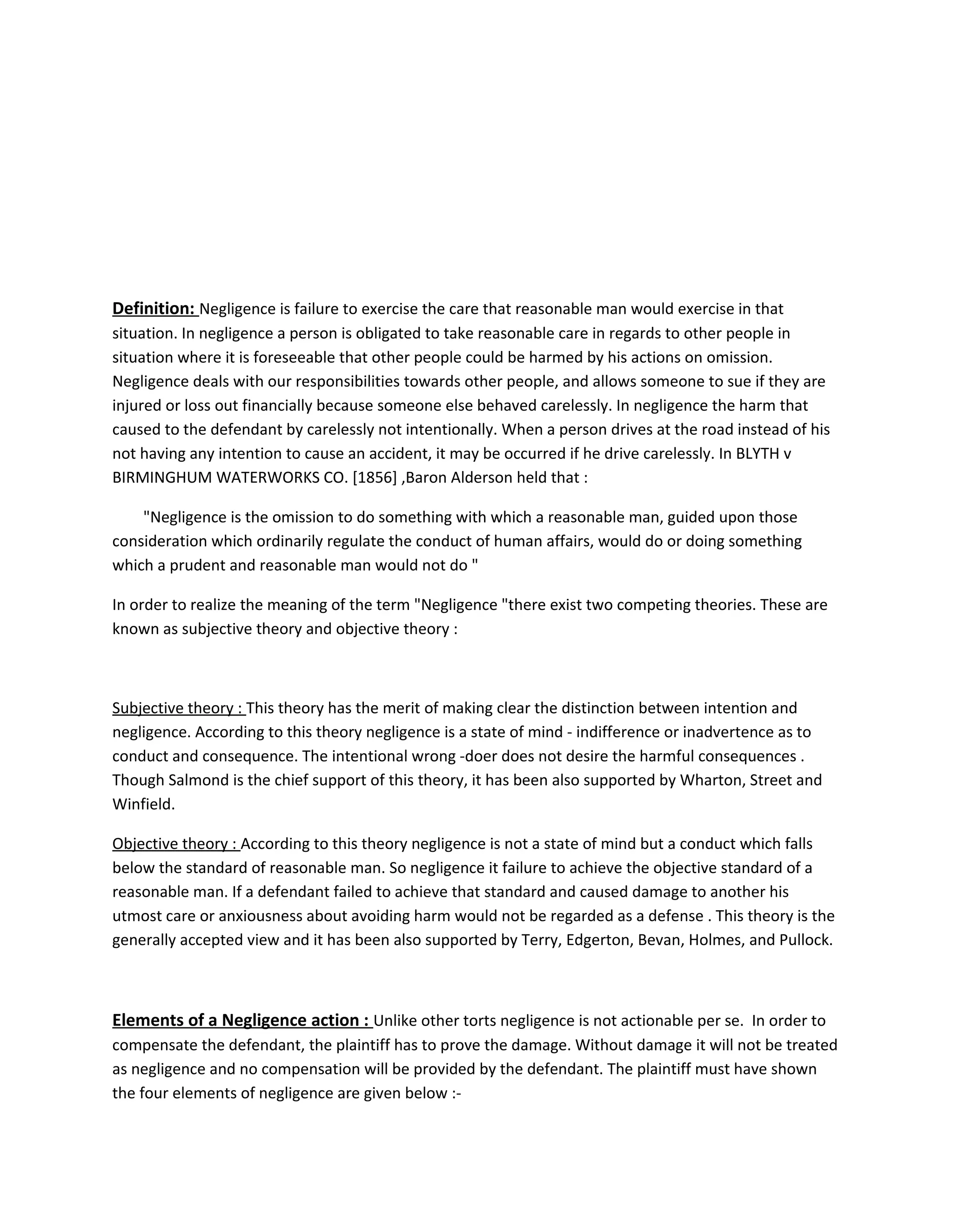 Negligence refers to the failure to exercise reasonable care that results in harm to another person. There are two theories of negligence - the subjective theory which views negligence as a state of mind, and the objective theory which is now generally accepted and views negligence as a failure to meet the standard of a reasonable person. To prove negligence, a plaintiff must show that the defendant owed them a duty of care, that duty was breached, injury resulted, and the breach caused the injury. There are tests to determine if a duty of care exists between the parties, such as foreseeability of harm, proximity of the relationship, and whether it is fair, just and reasonable to impose liability. Professionals may have a higher standard of