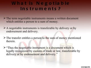 This document defines and explains negotiable instruments. It begins by stating that a negotiable instrument is a written document that entitles the holder to a sum of money and can be transferred through delivery or endorsement. It then lists the key characteristics of negotiable instruments, including being freely transferable and the holder having clear title. The document goes on to define the main types of negotiable instruments - promissory notes, bills of exchange, and cheques - and explains the essential components and parties involved in each.