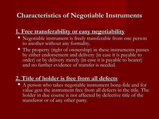 Negotiable instruments are written documents that create a right in favor of a person and are transferable by delivery or endorsement. Key characteristics include free transferability, the holder's title being free from defects, and the ability to sue in one's own name without notifying the debtor. Types of negotiable instruments include promissory notes, bills of exchange, and cheques, each with specific definitions and essentials for validity.