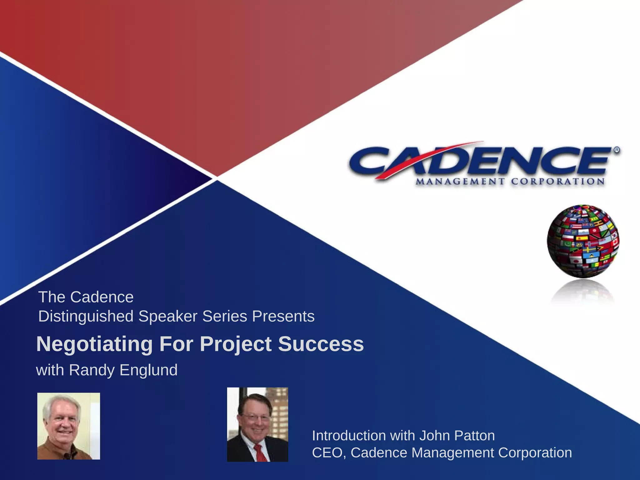 The Cadence Distinguished Speaker Series features a session on negotiating for project success with Randy Englund, emphasizing that successful projects depend on effective negotiation skills. Participants will learn essential rules, techniques, and the importance of relationships in negotiations to improve outcomes in organizational settings. Highlighted are the negotiation lifecycle, styles, and strategies to foster win-win scenarios for mutual gain.