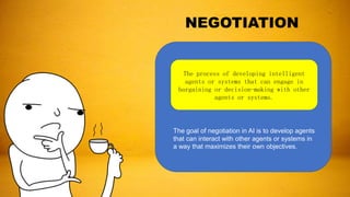 The document discusses negotiation and bargaining mechanisms for intelligent agents in AI, emphasizing the importance of efficient resource allocation, conflict resolution, cooperative decision-making, and human interaction. It outlines various negotiation protocols including bilateral, multilateral, auction-based, mediated, and automated negotiations, as well as different bargaining strategies such as distributive, integrative, concession-making, and anchoring. The document highlights how these techniques can help maximize objectives and facilitate communication and cooperation among agents.