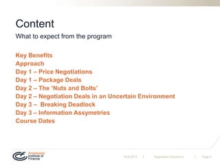 This 3-day negotiation training workshop will take place November 13-15, 2013 in Amsterdam. The workshop will focus on developing practical negotiation skills through exercises and cases. Day 1 will cover price negotiations and structuring package deals. Day 2 will discuss negotiation fundamentals and dealing with uncertainty. Day 3 will address breaking deadlocks and managing information asymmetries. The goal is for participants to learn negotiation strategies and tactics to master price negotiations, create value, and maintain composure under pressure.