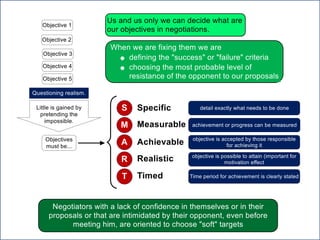 3. Effective negotiation requires preparation including defining objectives, gathering information on other parties, and determining negotiating strategy and concessions.