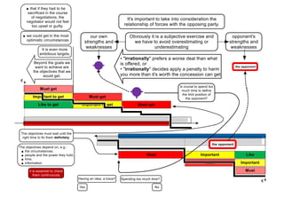 4. The negotiation process can be broken down into eight phases, with preparation, discussion, proposal, and exchange being the most important phases. Parties must be willing to modify positions to reach agreement.