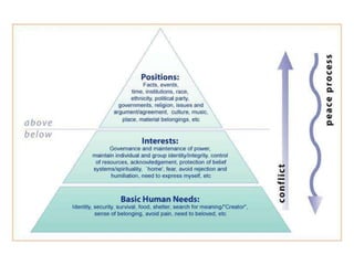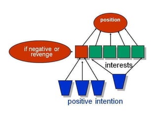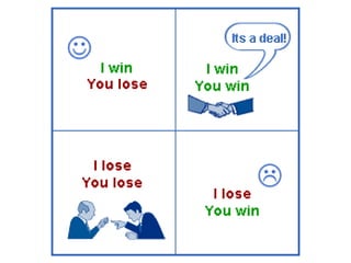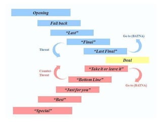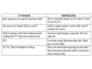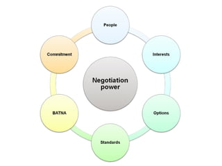 1) The document discusses the principles of principled negotiation as outlined by Roger Fisher and William Ury in their book Getting to Yes, including separating the people from the problem, focusing on interests not positions, inventing options for mutual gain, and insisting on objective criteria.