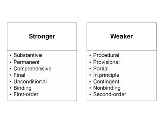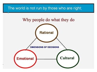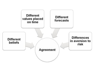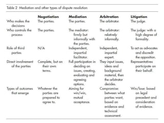 3) The document contrasts principled negotiation with positional bargaining, noting the former tends to produce wiser and more efficient agreements while maintaining relationships.