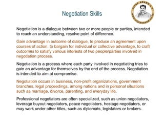 Negotiation is a dialogue between two or more parties aimed at reaching an understanding or agreement. It involves parties trying to gain advantage for themselves while also aiming for compromise. Negotiation occurs in various contexts like business, government, legal proceedings, and personal situations. It follows stages including preparation, discussion, clarifying goals, negotiating towards a win-win solution, agreeing on a course of action, and implementing it. The attitude, interpersonal skills, and knowledge of those involved are important elements to consider.