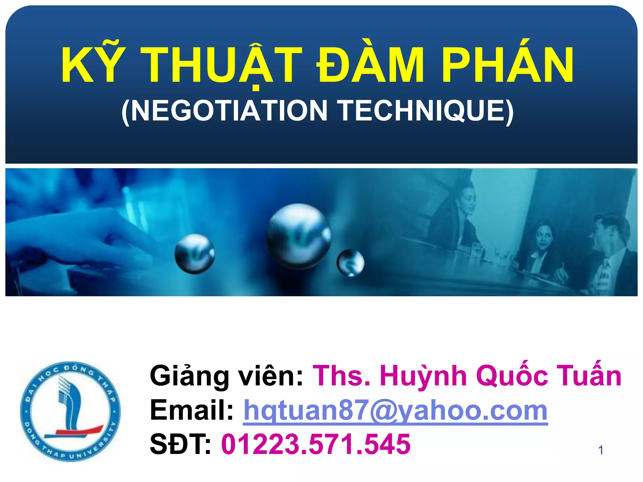 Tài liệu trình bày về kỹ thuật đàm phán trong kinh doanh, bao gồm khái niệm, đặc điểm và các hình thức đàm phán như phân bổ và hợp nhất. Nó nhấn mạnh tầm quan trọng của việc hiểu rõ BATNA (giải pháp thay thế tốt nhất cho một thỏa thuận) và các yếu tố ảnh hưởng đến quá trình đàm phán. Tài liệu cũng cung cấp ví dụ minh họa và khuyến nghị chiến lược để đạt được thỏa thuận có lợi cho cả hai bên.