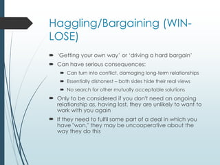 This document provides guidance on negotiating to reach a WIN-WIN outcome. It discusses the differences between haggling, which results in WIN-LOSE situations and damages relationships, and cooperative negotiation, which aims to find mutually acceptable solutions. The key stages of negotiation are preparation, discussion, clarifying goals, negotiating towards WIN-WIN, agreeing and implementing the agreement. Preparation involves understanding interests and alternatives. Discussion involves presenting cases and listening. Clarifying goals identifies common ground. Aiming for WIN-WIN focuses on gains for both sides. Failure to agree may require further meetings. The overall goal is an agreement that leaves both parties feeling they have obtained benefits.