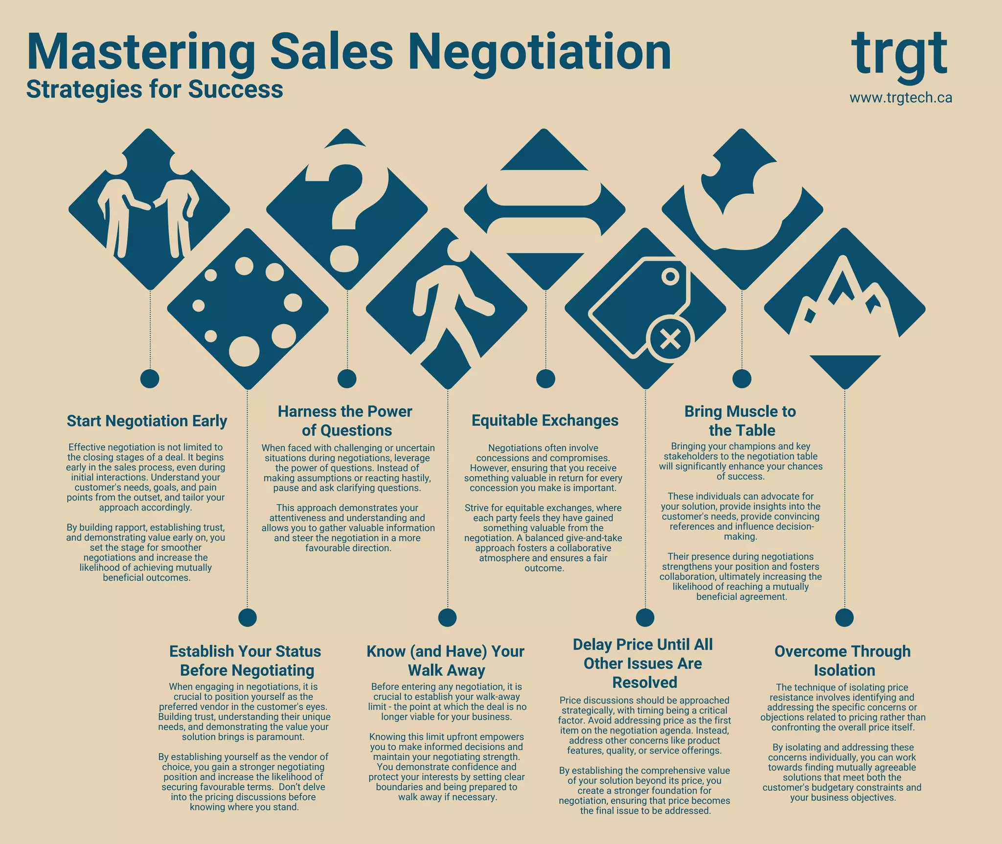 The document outlines strategies for successful sales negotiations, emphasizing the importance of starting negotiations early by understanding customer needs and building rapport. It advises on leveraging questions, ensuring equitable exchanges, and bringing key stakeholders to the table to enhance negotiating power. Establishing oneself as a preferred vendor, knowing walk-away limits, delaying price discussions, and isolating pricing objections are also highlighted as critical tactics for achieving favorable outcomes.