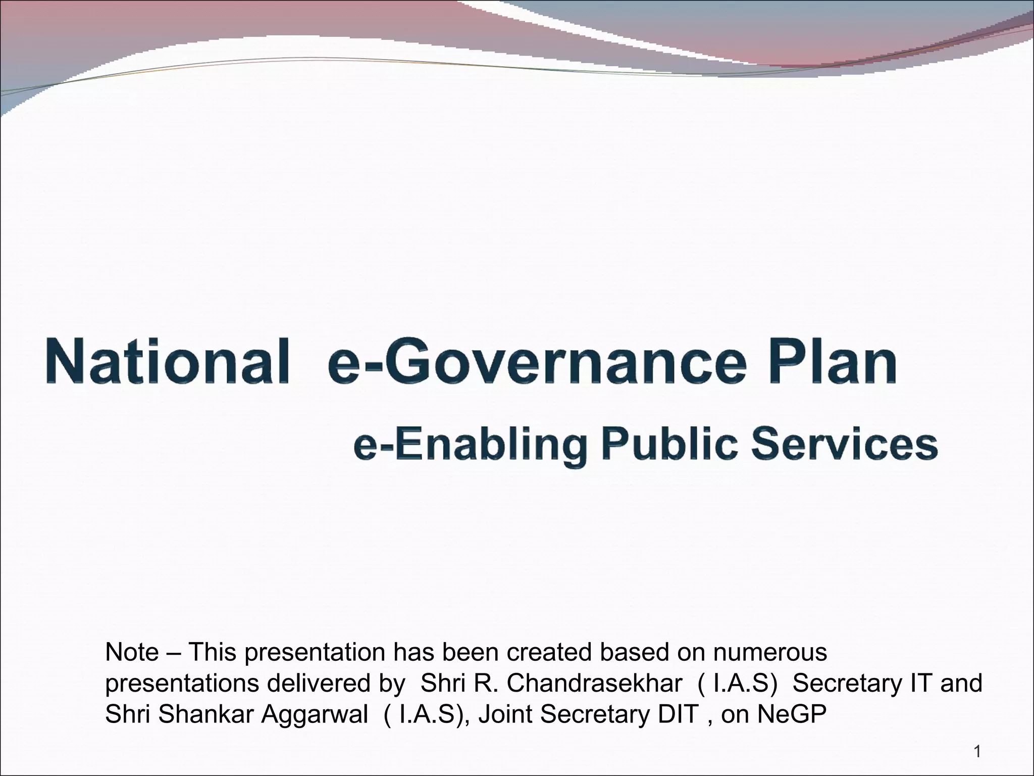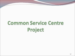 The document summarizes India's National e-Governance Plan (NeGP) which aims to make government services accessible to citizens through common service centers. Key points include: