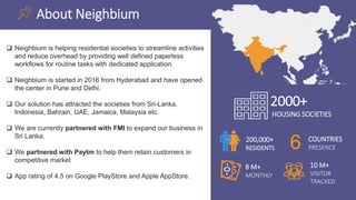 Neighbium is an award-winning ERP solution launched in 2016 that helps residential societies streamline operations through paperless workflows, with a strong presence in multiple countries. The platform features comprehensive management tools including automated billing, visitor tracking, and secure communication, and has garnered high app ratings. Neighbium is recognized for its innovative solutions in property management, ensuring the security of users' data through secure backups and compliance measures.
