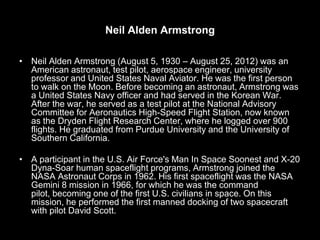 Neil Alden Armstrong (1930-2012) was an American astronaut, test pilot, and the first person to walk on the moon during the Apollo 11 mission in 1969. He graduated from Purdue University and served as a U.S. Navy officer before joining NASA, where he made significant contributions to space exploration, including the first manned docking of spacecraft. Armstrong received numerous honors for his achievements, including the Presidential Medal of Freedom and the Congressional Gold Medal, and passed away due to complications from blocked coronary arteries.