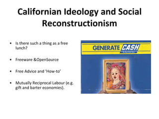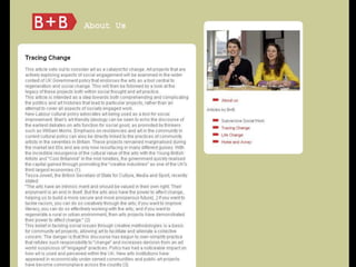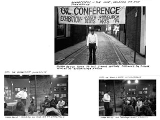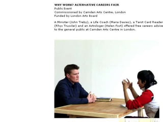 The document discusses considering audiences when formulating a strategy or project. It suggests thinking about whether the audience will differ from expectations, be random or specialist, and how to engage them. It also discusses whether the audience will be passive or active, whether the work can empower or benefit both the artist and audience, and researching audience culture. The document provides examples of art projects involving audience participation or collaboration.
