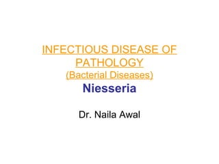 Neisseria gonorrhoeae and N. meningitidis are pathogenic Neisseria species. N. gonorrhoeae causes gonorrhea, transmitted sexually or from mother to child. It infects the urethra, cervix, and other sites. Without treatment, it can spread and cause complications like pelvic inflammatory disease. N. meningitidis causes meningitis, transmitted through airborne droplets. It infects the nasopharynx and can spread to the blood and CNS. Laboratory diagnosis involves gram stain, culture on selective media, and rapid carbohydrate utilization tests. Gonorrhea pathology in females includes salpingitis, tubo-ovarian abscess,