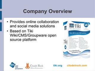 Tiki is an open source content management, collaboration, and social networking platform. It is used by many organizations for websites, knowledge bases, project coordination, and more. The company provides customization and support services for Tiki but depends on the open source community for ongoing development and infrastructure support. The business model keeps costs low through the open source model and generates ongoing revenue from customization, consulting, and support services. The ecosystem includes software developers, designers, hosting providers, and customers who use and contribute to Tiki.