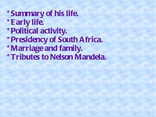 Nelson Mandela was born in 1918 in South Africa. He became actively involved in politics opposing apartheid in the late 1940s. Mandela co-founded the African National Congress Youth League and later became president of South Africa from 1994-1999, being the first Black president elected in a fully representative democratic election. During his presidency, Mandela oversaw the introduction of policies aimed at reducing inequality and establishing universal healthcare, education, electricity, water access and more for all South African citizens.