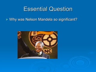 Nelson Mandela was put in jail for fighting apartheid, a law that allowed racial discrimination in South Africa. He spent 27 years in prison before being released. Mandela became a leader by fighting for independence and representing the interests of the South African people. After his release, he won the 1993 Nobel Peace Prize and became South Africa's first elected black president for demonstrating the power of nonviolent protest during the anti-apartheid movement.