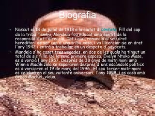 Biografia Nascut el18 de juliol de 1918 a la ciutat d' Umtata . Fill del cap de la tribu Tembu, Mandela fou educat amb sentit de la responsibilitat i direcció. Tot i així, renuncià al seu dret hereditari de ser cap d'una tribu xosa, i va llicenciar-se en dret l'any 1942 i entrà a treballar en un despatx d'advocats. Mandela s'ha casat tres vegades, en dos de les quals ha tingut un total de sis fills. De la seva primera esposa, Evelyn Ntoko Mase, es divorcià l'any 1957. Després de 38 anys de matrimoni amb Winnie Madikizela se separaren després d'uns escàndols polítics es divorciaren el 19 de març del 1996.. El seu tercer matrimoni es celebrà en el seu vuitantè aniversari, l'any 1998, i es casà amb Graca Machel, vídua.