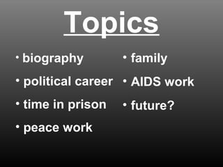 Nelson Mandela, born in 1918, was a prominent anti-apartheid revolutionary who co-founded the African National Congress Youth League and pursued equality for South Africans. After spending 27 years in prison, he became South Africa's first democratically elected president in 1994, focusing on reconciliation and constitutional development. Additionally, Mandela advocated for AIDS awareness through his campaign "46664" and was revered for his peace efforts, prompting concerns about South Africa's future after his passing.