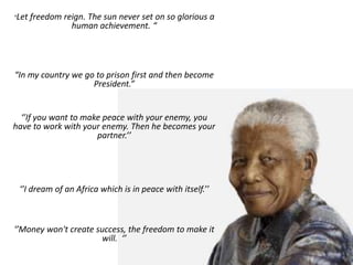 Nelson Mandela was a South African anti-apartheid revolutionary and politician who served as President of South Africa from 1994 to 1999. He was born in 1918 in South Africa and was expelled from university for his involvement in a student movement. He went on to help lead the armed resistance against South Africa's apartheid government, for which he was arrested and sentenced to life in prison in 1964. After 27 years in prison, he was released in 1990 and helped negotiate an end to apartheid. He was then elected President in 1994, becoming the country's first Black head of state.