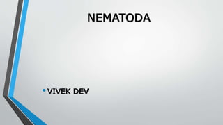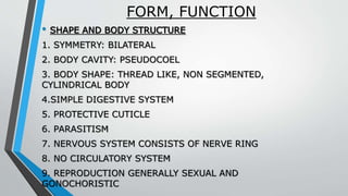 The document provides a comprehensive overview of nematodes, detailing their morphology, life cycle, and classification into classes Enoplea and Rhabditea. It specifically discusses the biology and pathogenicity of various species such as Trichuris trichiura (whipworm), Ascaris lumbricoides (roundworm), and Wuchereria bancrofti (causing lymphatic filariasis), including their interaction with hosts and symptoms of infection. Additionally, it covers diagnosis, treatment options, and preventive measures for nematode infections.