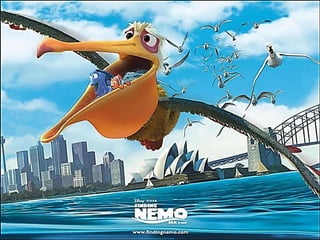 This document provides a list of characters from the Pixar film Finding Nemo. It includes the main characters of Nemo, his father Marlin, and Dory, as well as supporting characters like Crush the sea turtle, Bloat the whale, Bruce, Chum, Bubbles, Sheldon, Gill, and others seen in the film. The document analyzes the film through the animal kingdom lens by naming and categorizing the different species represented by the characters.