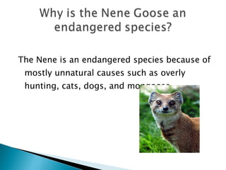 The Nene goose is an endangered species native to the Hawaiian Islands. It has weak wings and can only fly when necessary. The species is threatened due to overhunting as well as predators like cats, dogs, and mongooses introduced to the islands. Most respondents believed the Nene population could increase through volunteering efforts and educating others about the species.
