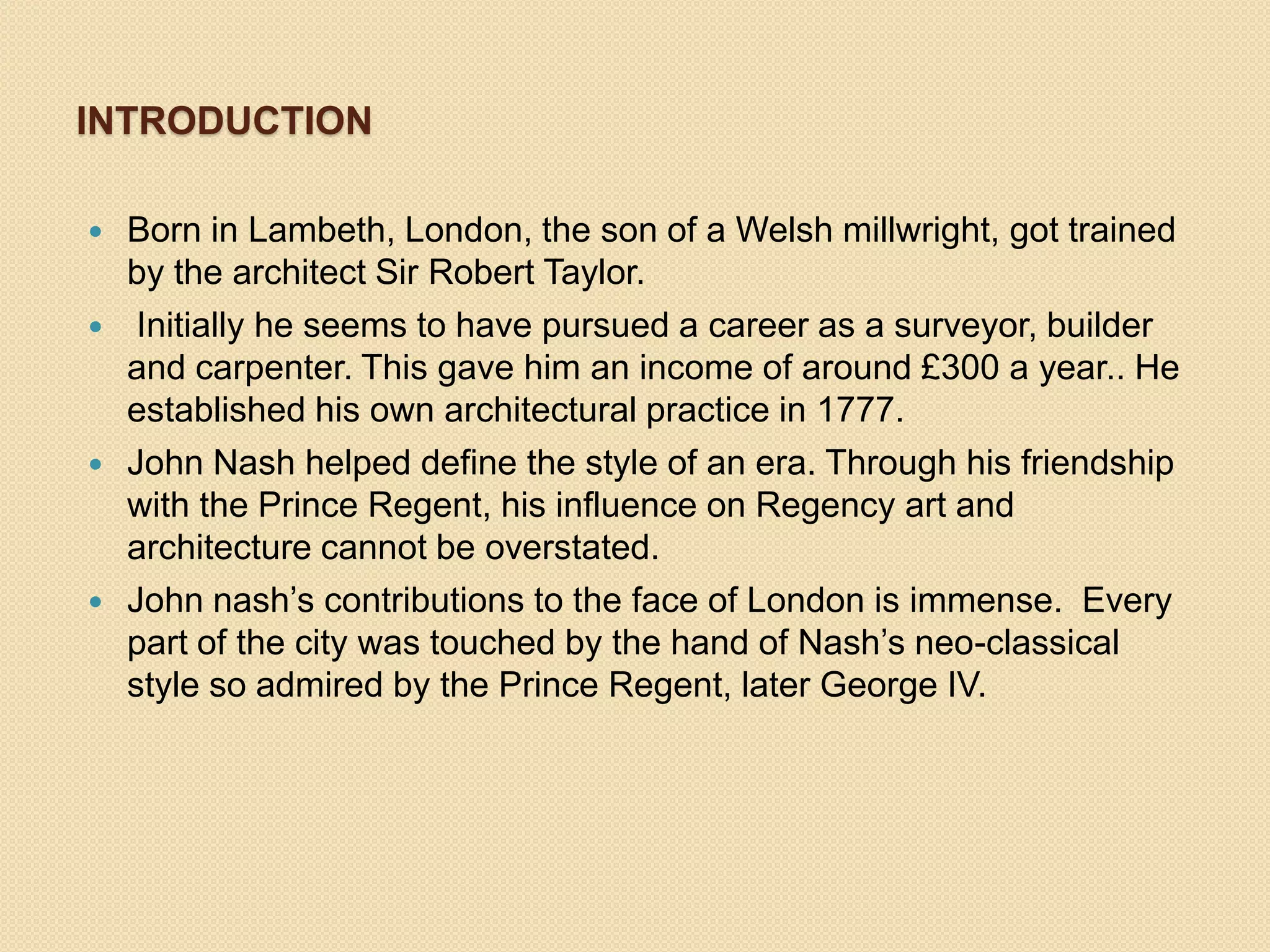 John Nash was an English architect who helped define Regency style. He established his own practice in 1777 and became influential through his friendship with the Prince Regent. Some of Nash's notable works included developing Regent's Park and Regent Street in London, remodeling the Royal Pavilion in Brighton, and beginning reconstruction of Buckingham Palace. Nash made immense contributions to London's architecture and helped establish neoclassical style as admired by the Prince Regent.