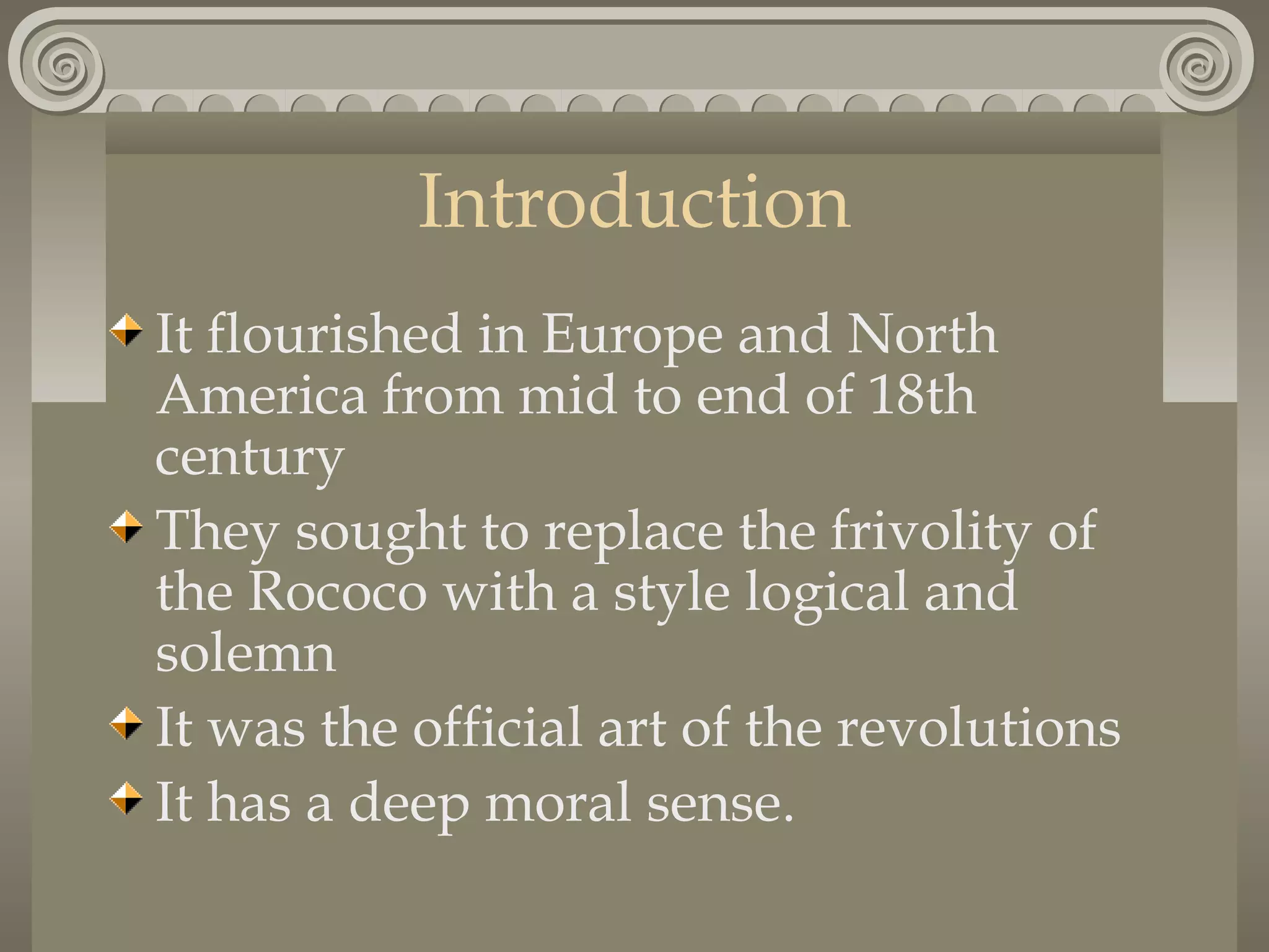 Neoclassical art flourished in Europe and North America from the mid to late 18th century as artists sought to replace the frivolity of Rococo with a more logical and solemn style. In architecture, the model was Ancient Rome and Greece, as seen in the works of architects like Ledoux, Percier and Fontaine. In sculpture, artists like Canova and Thorvaldsen emulated Classical Greek ideals using white marble. Painting centered in Rome, with artists like Jacques-Louis David creating grand historical works with simplified compositions inspired by mythology.