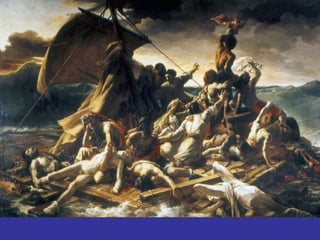 ROMANTICISMO PLENO. GÉRICAULT.A balsa da Medusa. 1819. Nesta obra os náufragos avistan o seu barco salvador esperanzados (realmente é unha metáfora da recriminación ao Estado). É unha obra baseada nun feito real, de feito introduce a documentación para realizar un cadro de gran estilo (plasma o rescate do Argus /o motín que se efectuou a bordo / episodio de canibalismo). É un cadro moi meditado que reflexa a concepción romántica, ó tempo que fai partícipe ao espectador do drama. Plasma sentimentos enfrontados esperanza- impotencia/ esperanza-desesperanza. É unha composición con dúas pirámides (dispersión de forzas) xunto a esceas moi expresivas.
