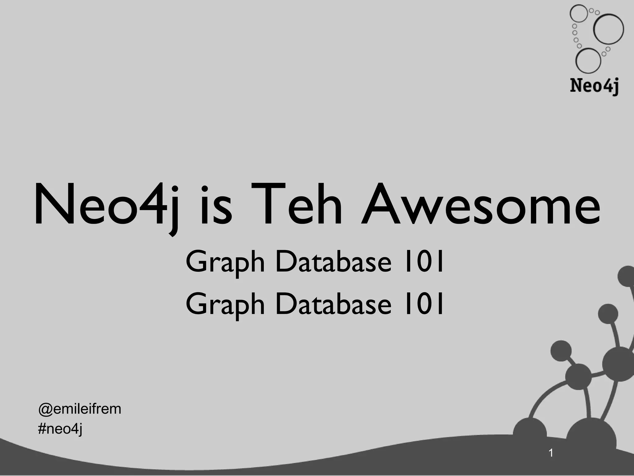 This document provides an overview of the graph database Neo4j. It discusses that Neo4j is a graph database with nodes, relationships, and properties that is well-suited for complex, highly connected data. Examples are given demonstrating how Neo4j can be used for network management in telecommunications companies and content management, access control, and collaboration at Adobe. Cypher, the query language for Neo4j, is also introduced.