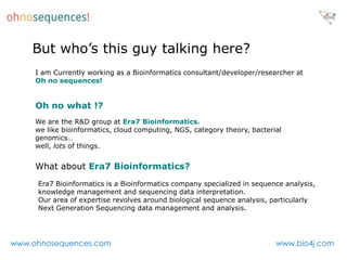 This document discusses Neo4j and its applications in bioinformatics. It describes Bio4j, an open source bioinformatics graph database built using Neo4j that integrates data from sources like Uniprot, NCBI taxonomy, Gene Ontology, and more. Bio4j models biological data as nodes and relationships in a graph structure rather than tables. This allows for more flexible querying and knowledge integration. The document provides examples of how Bio4j can be accessed through its Java API, Cypher query language, Gremlin traversal language, and REST API. It also describes some tools and visualizations for exploring and analyzing Bio4j data.